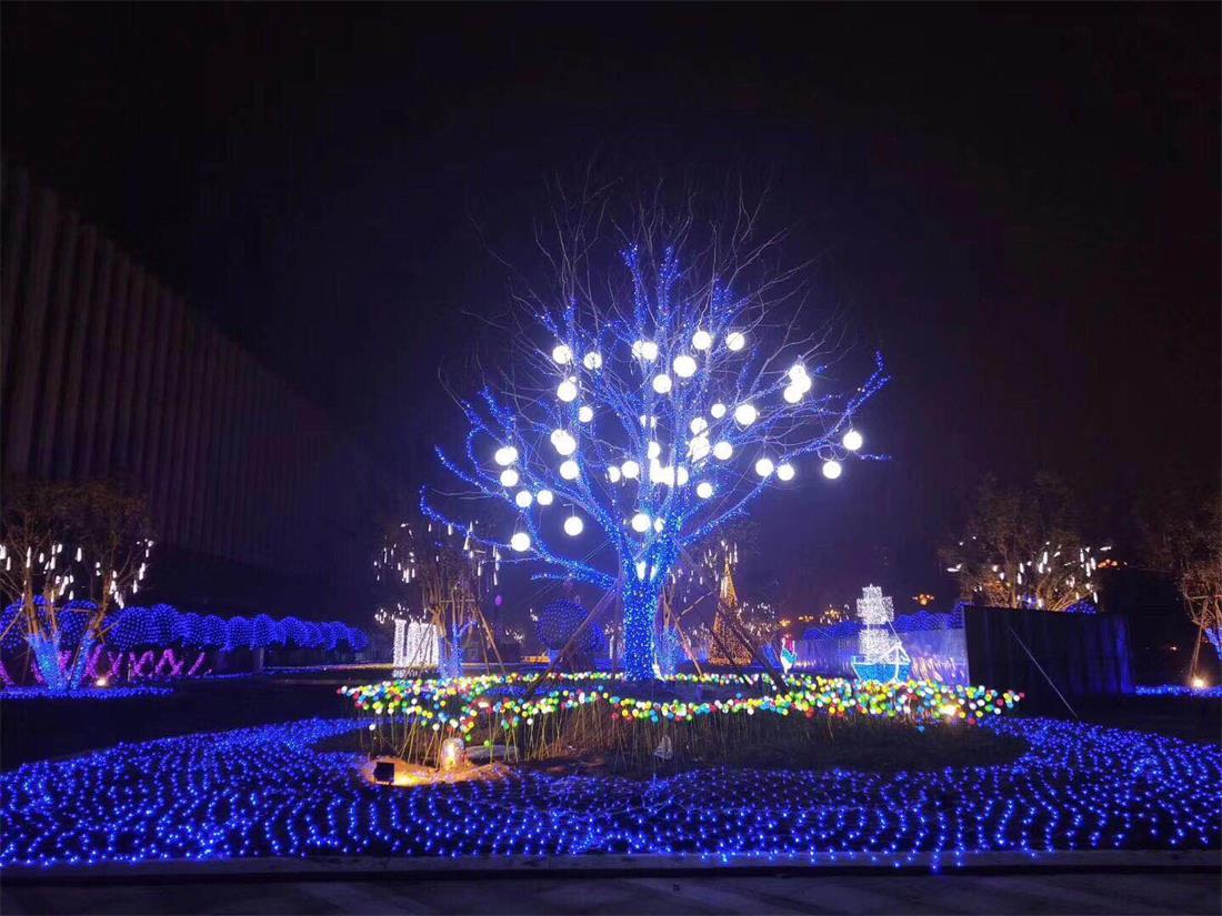 水滴裝飾樹木亮化。其實(shí),大樹樹枝已經(jīng)無(wú)需使用串燈進(jìn)行亮化,地面上五彩的插地圓球燈已經(jīng)將周圍的環(huán)境照的透亮,樹枝上只加了一些“搖搖欲墜”的水滴,就足夠美麗了??吹竭@樣的美景,真的會(huì)忍不住將它定格在手機(jī)相冊(cè)里。