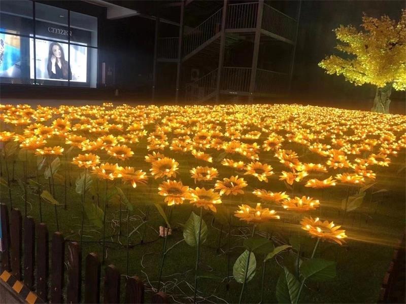 2、向日葵燈海—向日葵總是向陽而生,給人積極向上的精神鼓勵,向日葵的花語有:沉默的愛、忠誠、熱愛生活、投緣,雖然沒有向日葵沒有玫瑰那么浪漫,沒有百合那么純凈,但它陽光、明亮,用向日葵插地?zé)粼炀敖^對會收到大眾喜歡。