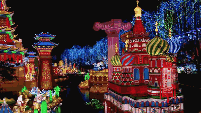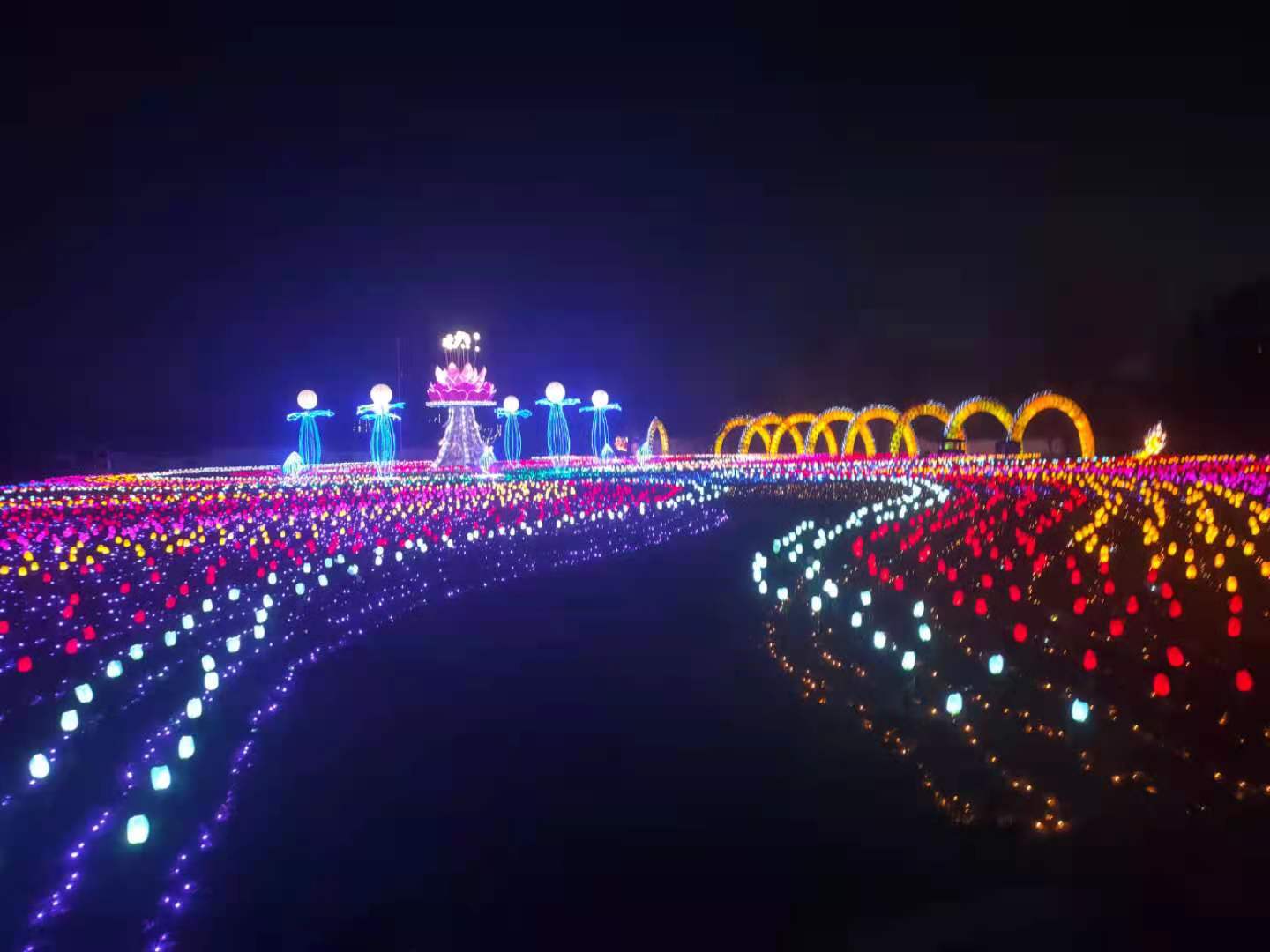 夜幕降臨,華燈初上。景區(qū)樹(shù)立的巨型燈飾由百花爭(zhēng)艷、百鳥朝鳳等幾部分組成,不僅夜間散發(fā)出絢麗光芒,而且內(nèi)容祥瑞吉利,