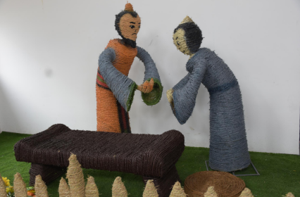 2.中間環(huán)節(jié):以結(jié)構(gòu)件的基礎(chǔ)上用稻草繩做纏繞編扎,用草繩包住整個(gè)結(jié)構(gòu)件, 形成稻草工藝品的外在表象,期間用細(xì)鐵絲或麻繩固定。編扎的細(xì)致、接 頭的固定方式?jīng)Q定稻草工藝品的外觀(guān)質(zhì)量。