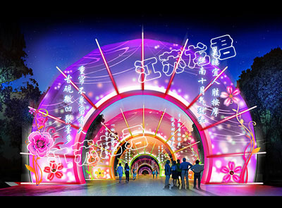 創(chuàng)意說明:以一個(gè)個(gè)扇形彩燈組成一個(gè)通道,每個(gè)扇形彩燈設(shè)計(jì)不同的燈光顏色,展示江南風(fēng)景的優(yōu)美柔和,造型獨(dú)特。